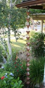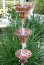 An Italian floral pattern is hand-tooled into the top of this beautifully crafted, pure copper cup rain chain. From the graceful arch of the wires that link the cups, to the perfectly round copper nuts that connect the cups together, the artistic styling is complete.